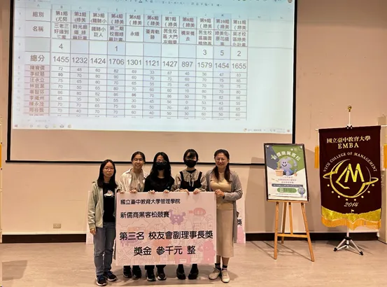 112年12月09日,國立臺中教育大學管理學院院必修課程【永續發展與社會創新】在張敦程老師與張馨化老師的共同籌劃下辦理第二屆【新儒商黑客松】競賽。今年的競賽主題分為「尤努斯社會創新、鐵肺小巨人、校園綠美化」三大項目,共計有11支隊伍47人參賽。為表彰優勝隊伍,課程邀請到管理學院林欣怡院長、EMBA校友會陳永峯理事長及郭鳳玉副理事長共同贊助頒獎儀式,第一名:管理學院院長獎(一萬元),第二名EMBA校友會理事長獎(六千元),第三名EMBA校友會副理事長獎2名(三千元)。