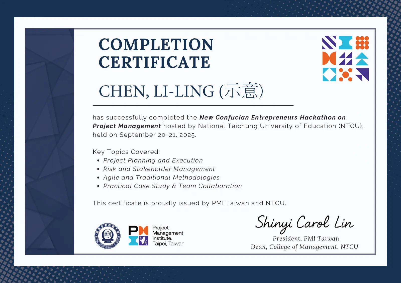 國立臺中教育大學管理學院與國際專案管理學會台灣分會(PMI Taiwan)合作舉辦的「新儒商黑客松 × 專案管理工作坊」,於 9月20日至21日在英才校區圓滿落幕。活動邀請國際專案管理學會台灣分會石家源專案經理 (PMP) 與林志隆專案經理 (PMP),帶領學生實地操作專案規劃工具,並融入活潑互動小組與個人競賽,課程全程精彩充實,吸引跨校學生踴躍報名。